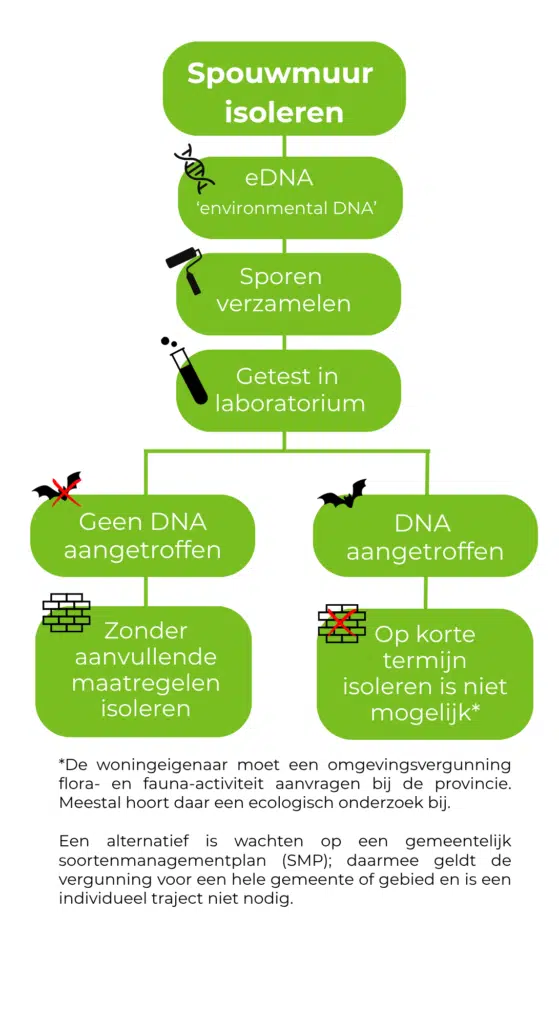 4. Wel DNA aangetroffen: als de eDNA-test positief is, mag een woning op korte termijn niet geïsoleerd worden. De woningeigenaar moet een omgevingsvergunning flora- en fauna-activiteit aanvragen bij de provincie. Meestal hoort daar een ecologisch onderzoek bij. Een alternatief is wachten op een gemeentelijk soortenmanagementplan (SMP); daarmee geldt de vergunning voor een hele gemeente of gebied en is een individueel traject niet nodig.