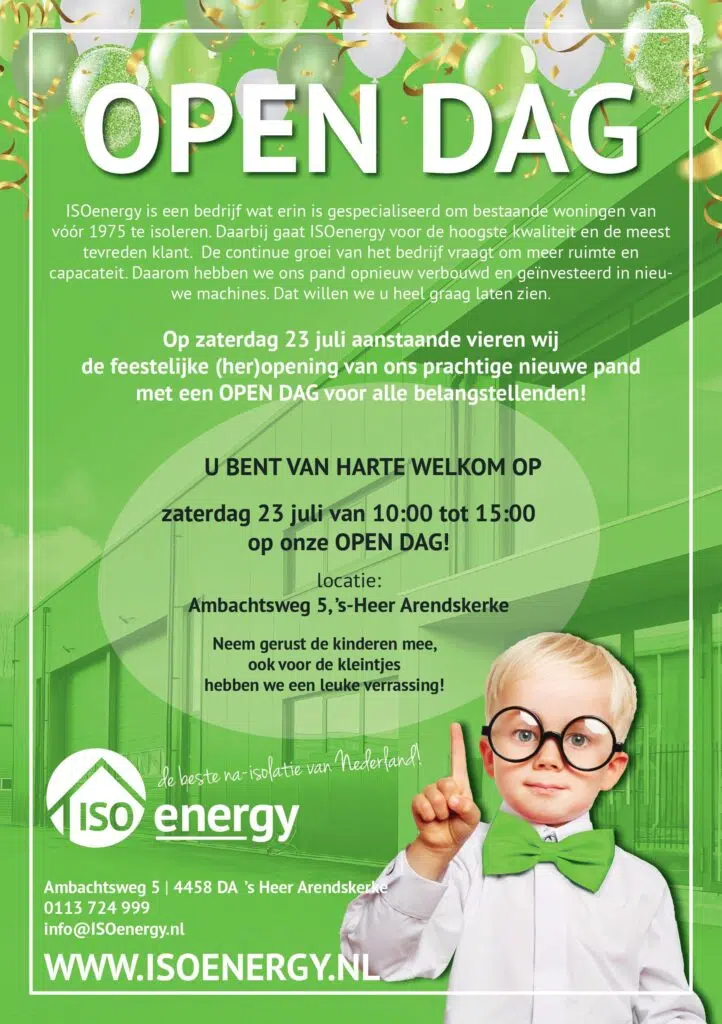 Op zaterdag 23 juli 2022 vanaf 10:00 uur opent ISOenergy haar deuren voor het grote publiek. ISOenergy is een bedrijf wat erin is gespecialiseerd om bestaande woningen te isoleren. Door de huidige groei hebben we ons pand verbouwd en geรฏnvesteerd in nieuwe machines. Dat willen we u heel graag laten zien! Met verschillende demo's laten we u zien wat we voor u kunnen betekenen.