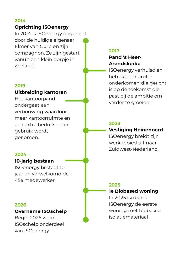 ISOenergy werd in 2014 opgericht door de huidige eigenaar Elmer van Gurp en zijn compagnon. Vanuit een klein dorp in Zeeland begonnen zij met een duidelijke ambitie: het verduurzamen van woningen door middel van hoogwaardige isolatieoplossingen. Het begon voorzichtig met 1 dag in de week isoleren, en kijken wat daaruit zou rollen. Wat startte als een kleinschalig initiatief, groeide al snel uit tot een professioneel isolatiebedrijf met toekomstvisie.
