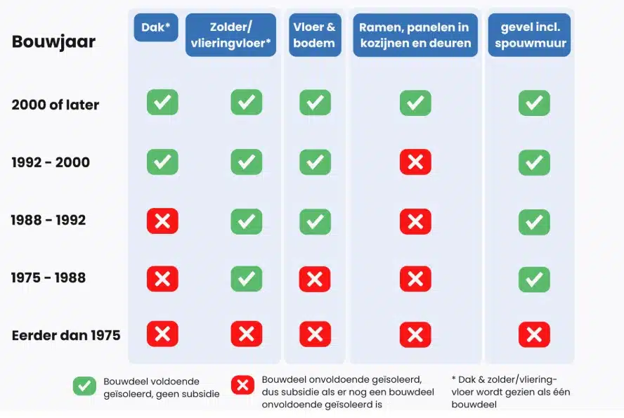 Let op: alleen de bouwdelen die in de betreffende bouwperiode als onvoldoende zijn aangemerkt, komen in aanmerking om met deze subsidie te worden geïsoleerd.